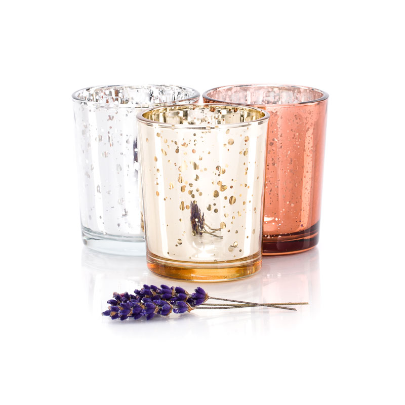 Warm up your decor with our mercury glass votive candle holders! The speckled antique metallic finish provides a soft, diffused light as the candles burn down and glow through the glass. These charming votive holders will add elegance to your table, shelf, or counter even when the candle is unlit. They are the perfect size to fit our 2oz votive candles, and make a great addition to votive candle gifts.